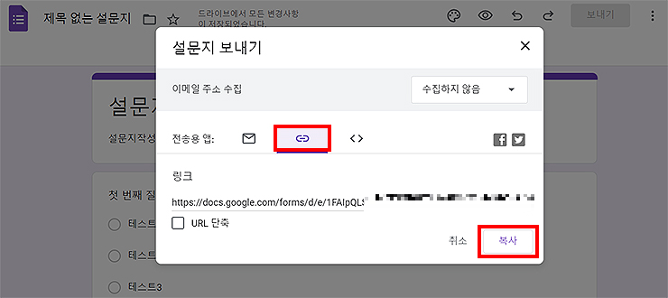 해당 설문지에 대한 링크가 나오게 되며, [복사] 메뉴를 누른 후 공유를 해주시면 됩니다. *보낸 설문지로 조사가 완료되면, 추후의 구글 폼에서 확인을 할 수 있습니다.