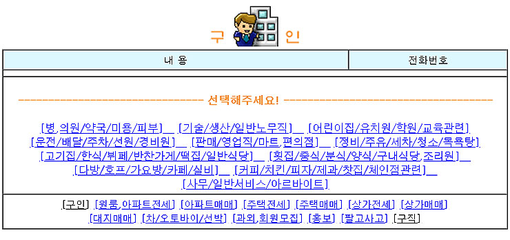 [구인], [구직] 메뉴 두 가지가 있으며, 구직으로 올려두실 분들은 [구직] 메뉴를 눌러주셔도 됩니다.
