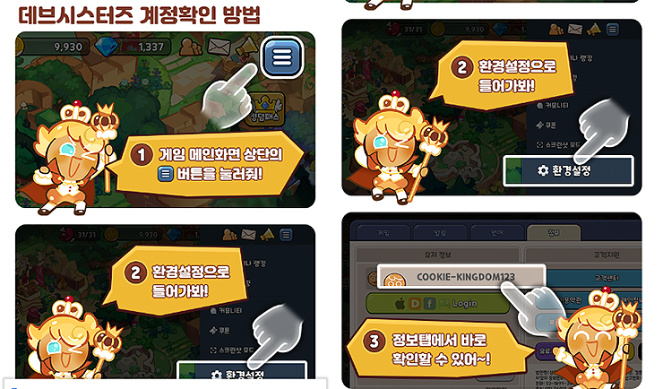 쿠폰은 제가 위에 정리해드린 번호를 입력해 주시면 되고, 인 게임에서 DevPlay는 환경설정에서 확인을 하실 수 있습니다. 처음 등록하시는 분들은 쿠폰 입력 페이지에 있는 Devplay 계정 확인 방법을 눌러 확인해 보시거나 아래 화면을 참고해 보시길 바랍니다.
