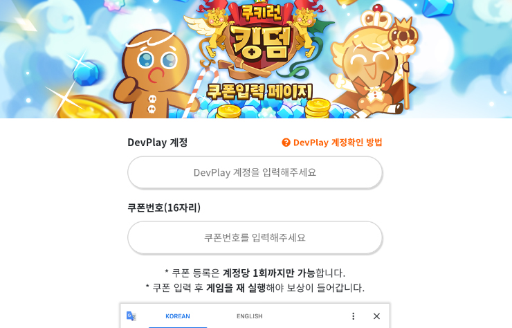 쿠폰입력 페이지로 DevPlay 계정과 쿠폰번호를 입력해 주시면, 쿠폰이 적용되게 됩니다.