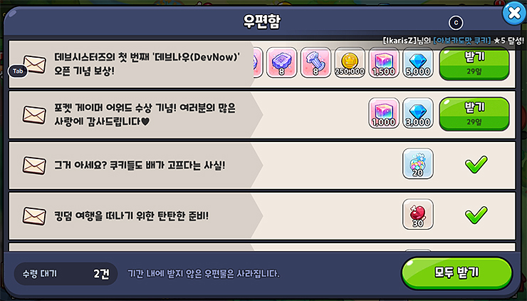 아래 보이는 화면과 같이 등록한 쿠폰의 보상이 들어오게 되고, [받기]를 눌러주시면 됩니다. 게임을 하는데 도움을 주게 되며, 조금 더 원활하게 플레이하실 수 있을 겁니다. 해당 게임을 자주 하신다면, 혹은 자주 하시는 게임이 있다면 커뮤니티나 공식 사이트의 정보를 확인해 보시길 바랍니다.