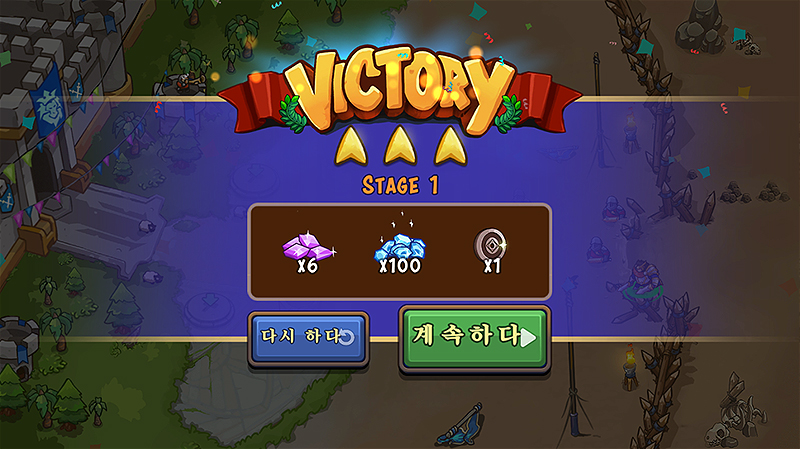 건물의 특성들을 살펴보시고, 업그레이드도 진행해 보세요. 처음 지은 타워를 터치하면, 업그레이드할 수 있는 부분이 나오기도 하고, 위로 더 지어 견고하게 할 수도 있습니다. Victory라고 첫 스테이지를 클리어하게 되면 볼 수 있는 화면도 이어졌습니다. 한번 하시고 나면, 어떻게 이뤄져 있는지 간단하게 파악할 수 있으니 어려운 점은 없으실 겁니다.