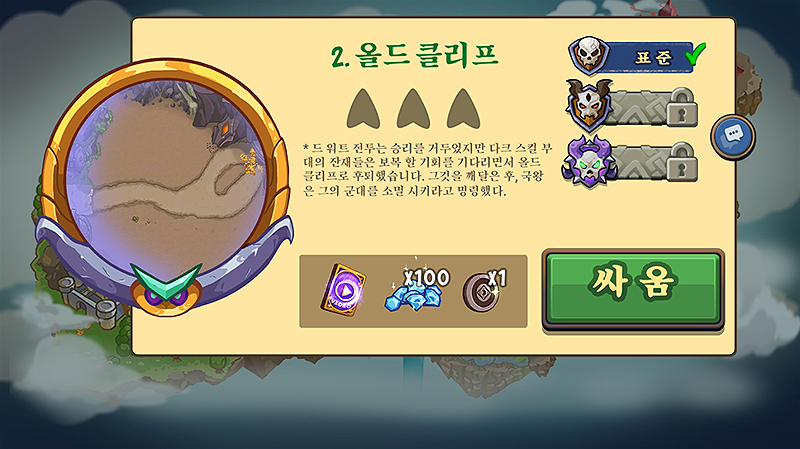 본 화면으로 돌아오게 되면, 이렇게 모험지역이 나오게 됐습니다. 1~스테이지를 클리어 해나가며, 진행을 하게 되는데요. 클리어 하실 때마다 게임머니와 관련된 부분을 얻게 되며, 이를 통해 더 발전시킬 수 있는? 요소로 보였습니다.