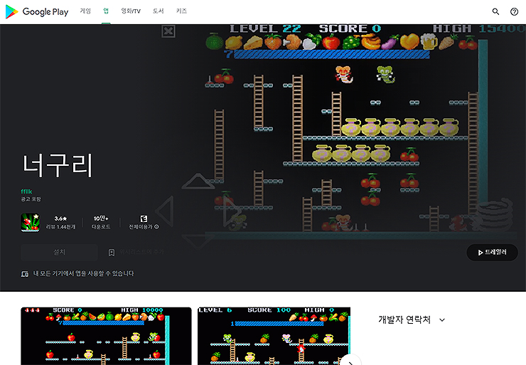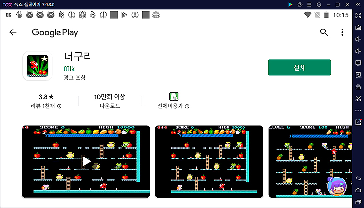 페이지로 들어오시면 [설치] 버튼이 바로 보이니, 설치 후 게임을 즐겨주시면 되겠습니다. 구글 플레이 페이지 안에서는 게임 관련 캡처와 간단한 소개 내용도 볼 수 있습니다. 너구리 게임 구글 페이지 바로가기