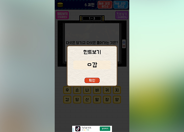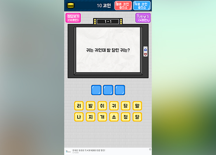 도저히 모르겠다면 힌트보기를 눌러 뒤에 글자나 힌트를 얻을 수 있습니다. 코인이 필요하기 때문에 어느 정도 제한이 있어 지속적으로 사용이 불가능한 점도 알고 계시면 좋습니다. 이런 식으로 재미난 넌센스 퀴즈를 어플로 즐길 수 있으며, 이 외에도 블로그나 사이트 등에서 나오는 문제들을 활용해 볼 수 있습니다. 하나의 예시로써 설명을 드렸으며, 간단히 참고만 해보시면 될 것 같습니다. 이상, 오늘의 글을 끝내며, 다음에도 재미난 어플 / 게임 등의 대해 소개를 이어가 보도록 하겠습니다. 감사합니다.