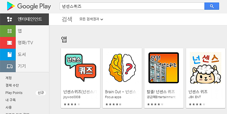 구글플레이어 넌센스퀴즈라고 검색을 하면 많은 어플들이 나오게 됩니다. 기본적인 퀴즈를 다루기도 하고, 탈출이라는 콘셉트가 담겨있는 등이 있었습니다.