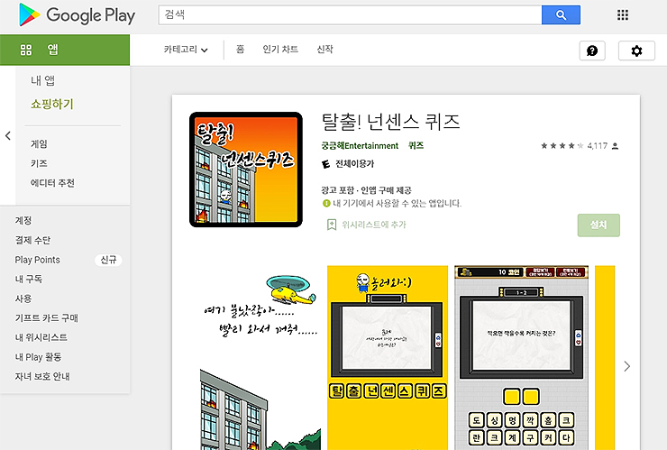 여러 가지 선택지 중의 탈출! 넌센스 퀴즈에 대해 다뤄보도록 하겠습니다. 일반 어플을 받는 것처럼 설치를 눌러 주시면 되고, 현 페이지에서는 앱 관련하여 소개와 내용을 볼 수 있었습니다.