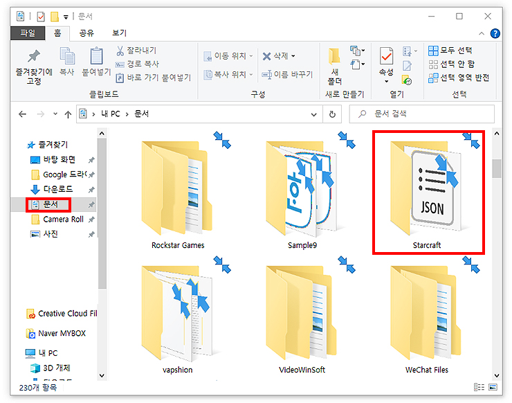 3. 문서에 있는 Starcraft 폴더를 찾아 더블클릭 합니다. (상단에 있는 문서 검색에서 스타크래프트를 영어로 입력하거나, S를 눌러 찾아 주시면 되겠습니다.)