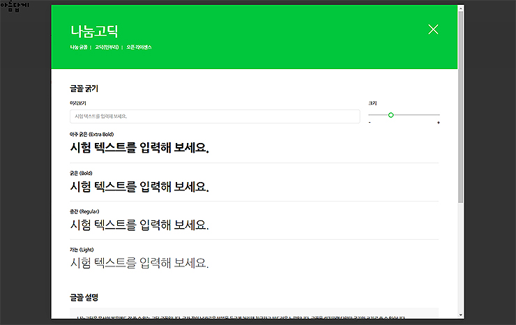 *나눔고딕 메뉴를 눌러주시면, 미리 볼 수 있는 화면과 어떤 폰트인지에 대한 설명도 살펴볼 수 있습니다.