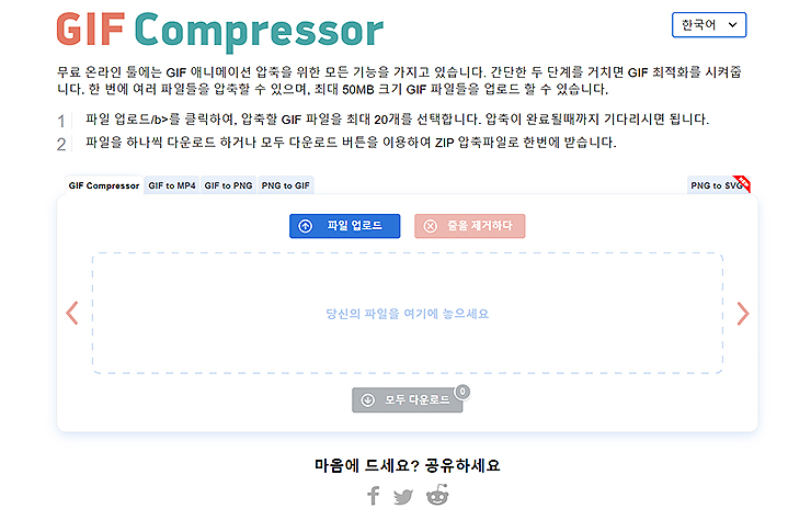 첫 번째 소개드리는 gif 용량 압축 사이트로, 'gif compressor'라는 곳입니다. 접속과 동시에 간단한 소개와 이용법을 볼 수 있습니다. 안내와 같이, [파일 업로드]를 눌러, 압축을 진행해주시면 됩니다. gif 파일 최대 20개를 압축할 수 있으며, 필요에 따라 사용을 해보시면 되겠습니다.