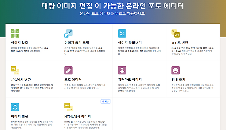 두 번째는 'iloveimg'라는 사이트입니다. 이전의 이미지 압축 관련 포스팅에서도 다뤘지만, gif 용량 줄일 때도 마찬가지로 이용할 수 있습니다. 첫번째 보이는 [이미지 압축] 메뉴를 눌러 실행해주시면 되고, 간단한 업로드를 통해 gif 용량을 줄일 수 있습니다. 이 사이트 역시, gif 용량 압축 뿐 아니라 다양한 이미지 편집이나 변환 등등을 할 수 있는 사이트입니다.