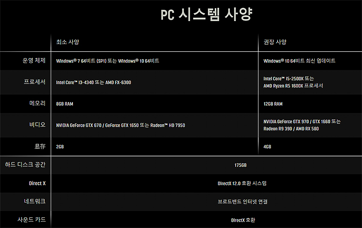 콜오브듀티 워존의 사양은 다운로드 페이지 하단에 위치해 있으며, 아래 표로도 첨부해두도록 하겠습니다. 사양은 게임 설치 이전에 참고해주시는게 좋으며, 되도록 권장사양쪽과 체크를 해보시길 추천드립니다.