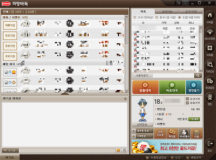 대기화면으로 넘어오게 되며, 처음이신 분들은 간단한 기보 설정과 닉네임을 만들어주시면 됩니다. 모든 준비가 되신 분들은 [맞춤대국] 혹은 [바로대국]을 눌러 게임을 진행해 보시길 바랍니다. 또는 [방만들기]를 눌러 자신이 직접 방을 만드는 방법도 있습니다.