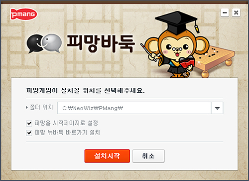 폴더 위치를 변경 및 설정할 수 있으며, 시작페이지나 피망바둑 바로가기 설치 등도 선택을 할 수 있습니다. 모든 선택을 마치신 분들은 [설치시작] 메뉴를 눌러주시면 되겠습니다.