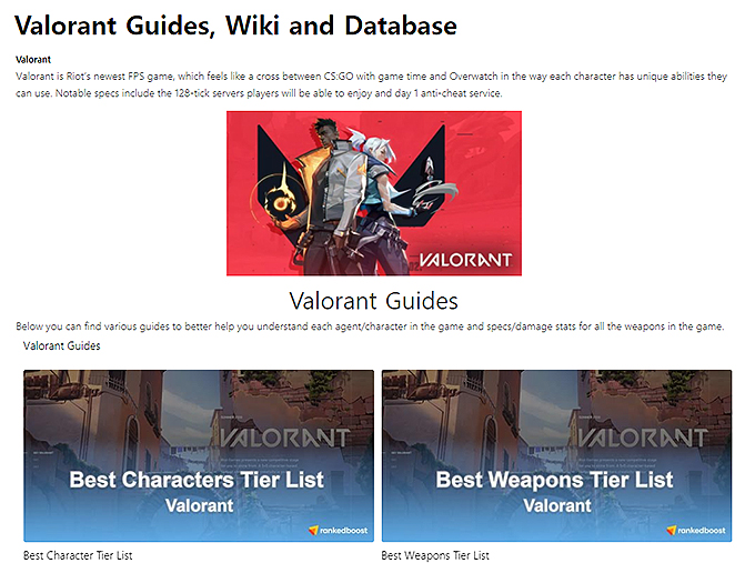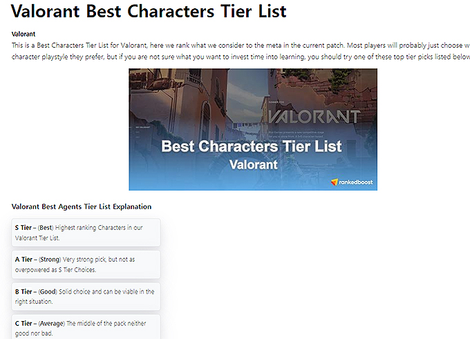 발로란트(valrorant) 캐릭터 티어가 정리되어 있는 곳으로 Rankedboost라는 곳이 있습니다. 총 관련도 정리를 드렸지만, 캐릭터도 볼 수 있으며, S부터~C티어까지 확인을 할 수 있습니다. 사이트로 먼저 이동을 해주신 후, [Best Characters Tier List Valorant]의 배너를 클릭해 주세요.