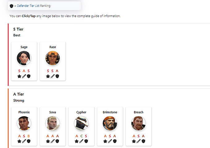- S Tier (Best)로는 Sage, Raze가 있었습니다.