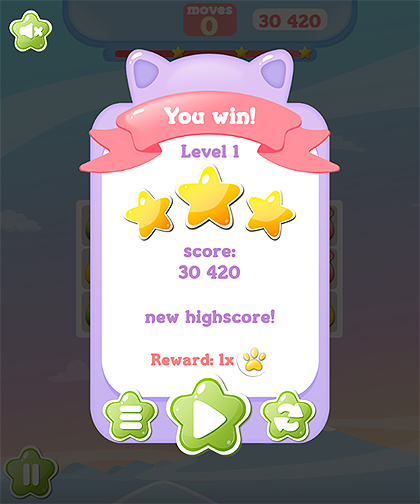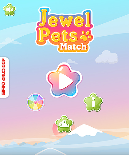 #1. 인트로의 화면으로 Jewel Pets Match의 로고가 나옵니다. 플레이 버튼을 누르면 시작이 되며, 스테이지 화면으로 전환됩니다. 1을 눌러 시작할 수 있습니다. 인트로 화면만 보셔도 아시겠지만, 아기자기한 모습 귀여운 그래픽으로 보였고, 동물들의 아이콘이 나온다는 걸 볼 수 있었습니다.